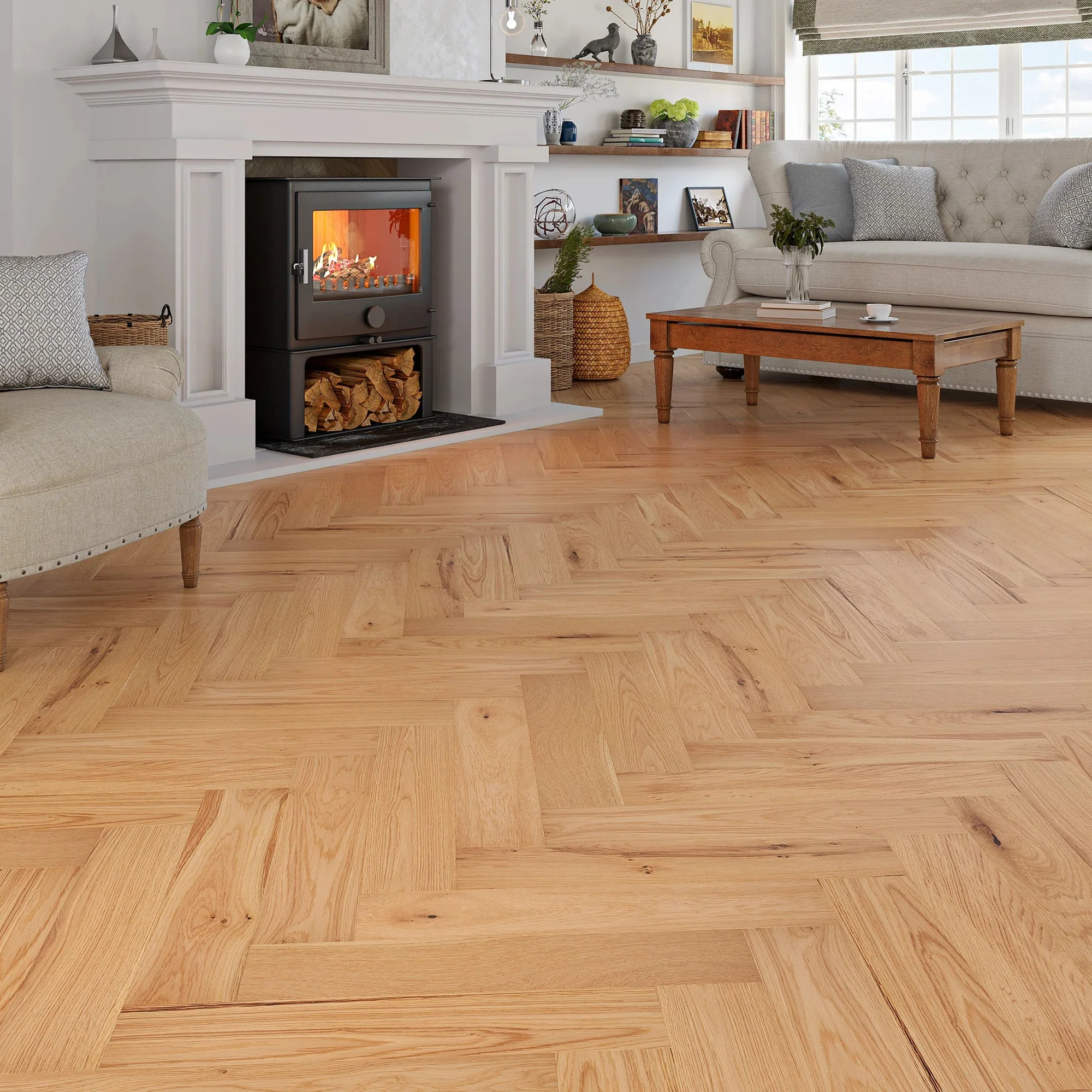 The Holloway Pearl Oak flooring captures the authentic beauty of rustic oak with its natural grain and medium shade. The herringbone pattern brings a classic and sophisticated look, while the rustic grade adds character, making each plank unique. This versatile design complements both modern and traditional interiors, creating a warm and inviting atmosphere in bedrooms, dining rooms, kitchens, and lounges.
